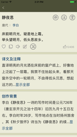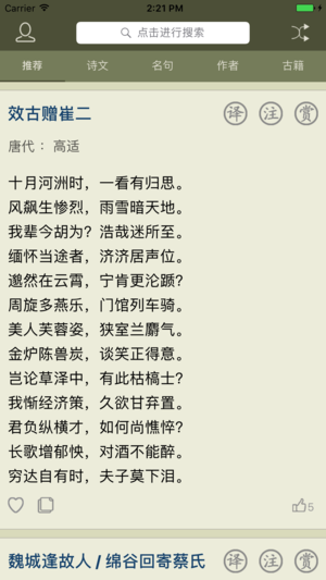 古诗文网下载地址 大小 32.5 MB 暂无安卓下载 苹果下载 暂无电脑下载 古诗文网更新内容 1、搜索功能优化; 2、增加专题模块; 3、增加APP分享功能; 4、BUG修复及性能优化。 古诗文网介绍 古诗文网作为传承经典的网站成立于2011年。古诗文网专注于古诗文服务,致力于让古诗文爱好者更便捷地发表及获取古诗文相关资料。 古诗文网截图