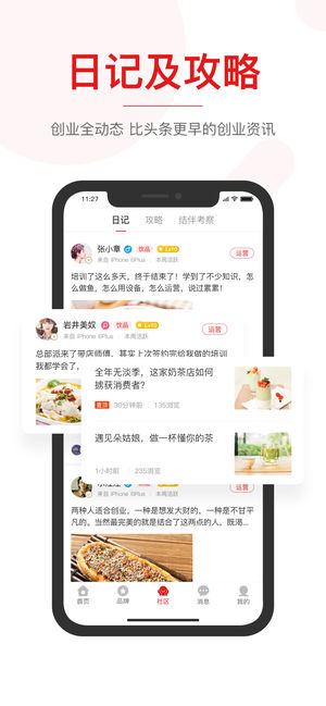 -平台全扶持:加盟日记、点评分享、结伴考察、开店攻略等环节展现开店过程.