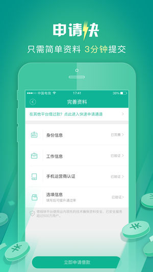 借钱快下载地址 大小 46.3 MB 暂无安卓下载 苹果下载 暂无电脑下载 借钱快更新内容 1、修复填写地址闪退问题,优化体验 借钱快介绍 借钱快,小额借钱神器,应急周转,找我就好! 【核心功能】 1.审核神速,现在申请,马上就能借到钱! 2.操作简单,手机上填资料,获得借款额度。 3.借钱金额500-5000元,还钱期限7-30天,灵活选择,低息多优惠,轻松无压力。 4.门槛低,证明有月收入,就不怕没钱花。 借钱快截图