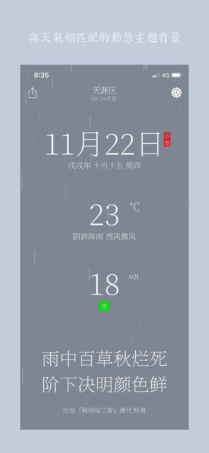 – 搭配各种主题的古诗词,除了耳熟能详的名句,还能查看古诗词详情、作者介绍、译文和赏析