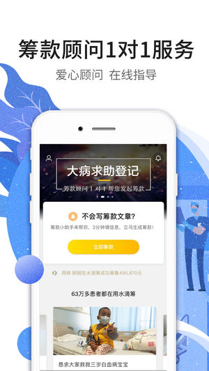 从申请、发起、传播、审核、提现各环节给予用户一对一指导,提供365天9:00–22:00的服务。筹款耐心解答各种疑问,帮助患者少走弯路多筹钱。
