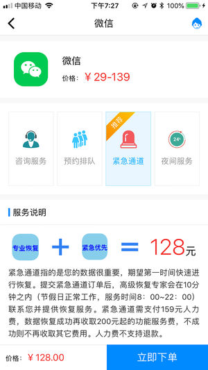 1. 加急通道,专家服务:针对数据非常重要的紧急情况,付款后,恢复专家会在10分钟内提供服务,恢复成功率也最高。如果是夜间还可以申请7*24小时服务