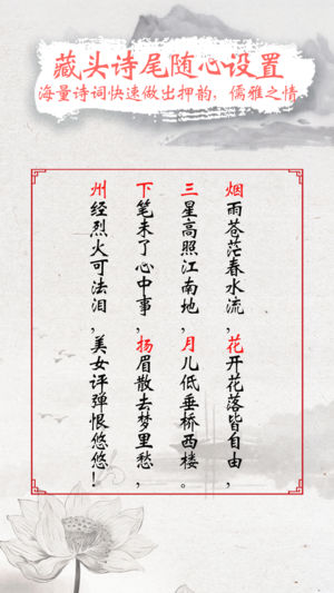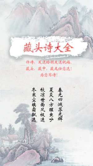 藏头诗在线生成器下载地址 大小 26 MB 暂无安卓下载 苹果下载 暂无电脑下载 藏头诗在线生成器更新内容 无 藏头诗在线生成器介绍 藏头诗在线生成器为你作词写诗,表白,愚人,欣赏诗句,陶冶情操必备神器。 藏头诗在线生成器截图