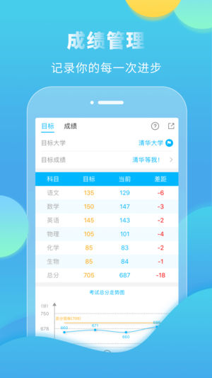 记录每一次模考、月考、周测、统考成绩,制定考试目标,清晰展示每一次的考试差距。系统智能成绩分析,帮你快速找到学习症结所在,查漏补缺!