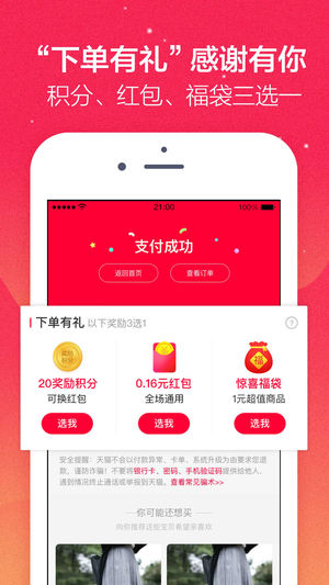 每次的购物都是在为下一次做准备,现在下单成功,立即奉上积分、红包、福袋任你挑,你说还有什么好犹豫的呢?