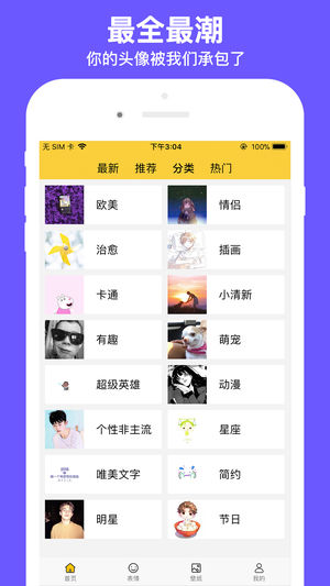 3、提供十多个分类,分类清晰明确,快速定位自己的爱好。让你的头像与众不同,个性十足。