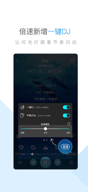 3、播放页的倍速新增一键DJ和节奏闪光,让歌曲秒变DJ混音版