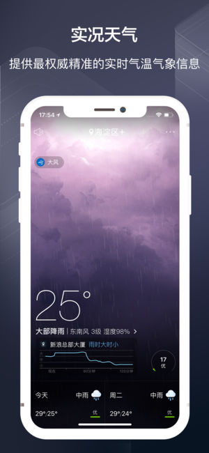 分钟级预报和降雨地图——未来降水预报,精准到分钟级别。用户所在街道,每时每刻雨雪变化,尽在掌握;