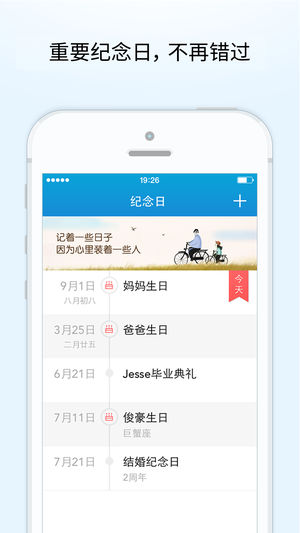 独立的纪念日视图,支持农历生日,毕业日、结婚纪念日、爱人生日一目了然