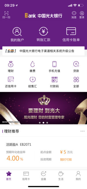 光大银行下载地址 大小 147 MB 暂无安卓下载 苹果下载 暂无电脑下载 光大银行更新内容 2018年12月22日 新增声纹登录,交易明细查询十五年记录,智能柜台扫码打印对账单。更多新增功能,等您下载体验! 光大银行介绍 光大银行为您推出的新一代手机银行,不论您是否为光大银行的用户,均可享用手机银行提供的丰富服务。 光大银行截图