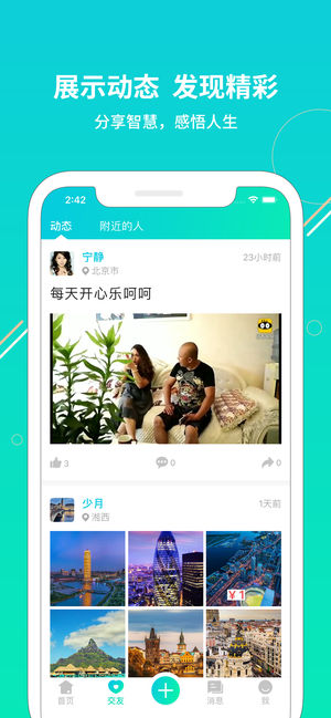 发布个人动态,分享点滴感悟,展现个人风采。查看附近人的动态,发现精彩瞬间