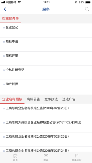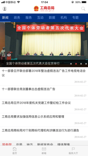 工商总局下载地址 大小 31.8 MB 暂无安卓下载 苹果下载 暂无电脑下载 工商总局更新内容 2018年4月11日 修改部分错误,提升流畅性。 工商总局介绍 工商总局移动客户端依托国家工商行政管理总局政府网站,向社会公众提供“新闻、政务、服务、互动、数据、机构、专题”服务。 工商总局截图