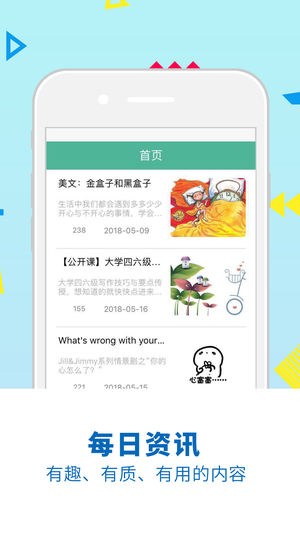 3)大胆开口:解决应试教育,死记硬背,中文思维等英语学习方式,鼓励大胆开口说英语,鼓励在不断练习口语中进步,无论您是蓬头垢面在家,都可无惧尴尬和犯错。
