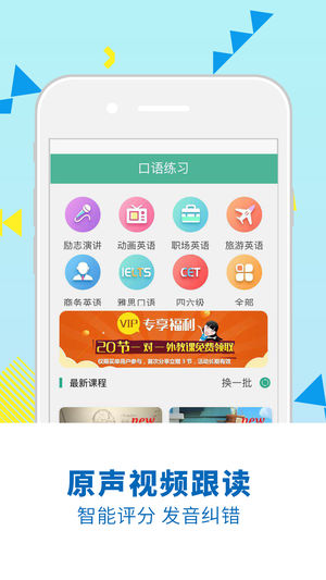 1)趣味英语视频:围绕职场英语、商务英语、雅思口语、等生活口语、一个视频就是一个场景课堂,模拟演练、智能打分纠正、点屏查词、拓展词汇;