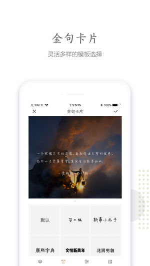 精简的交互操作,简洁大方的UI设计,我们重新定义了句子应用。在这里只有句子,严肃的句子,励志的句子,唯美的句子,心动的句子,伤感的句子,愿你每天能遇到一句让你赏心的话,一幅悦目的图,更愿你因此天天有个好心情。