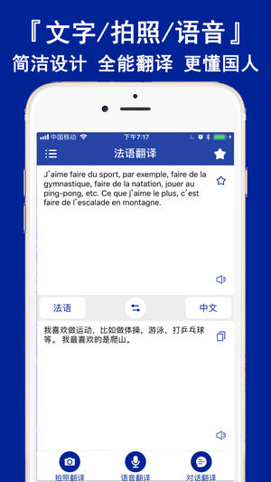 3,语音翻译:最新人工智能技术,高分辨率人声识别转为文字翻译!法国旅游/法语学习必备翻译助手。