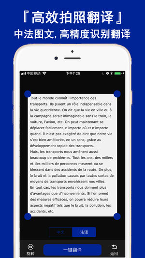 2,拍照翻译:随身拍照片识别翻译、相册选图翻译任意选;拍照一键翻译,旅游出行、阅读法语学习,高效率翻译利器。